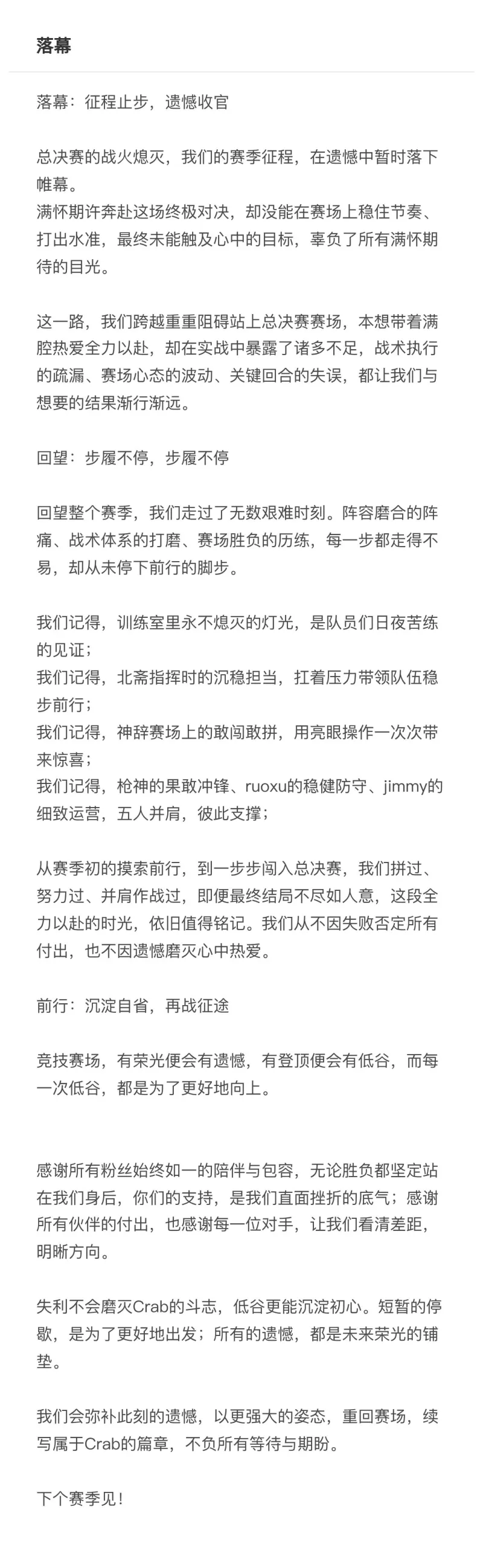 虎扑04月26日讯 倒数第一惨淡收场,Crab赛后长文:失利不会磨灭Crab的斗志。原文如下: